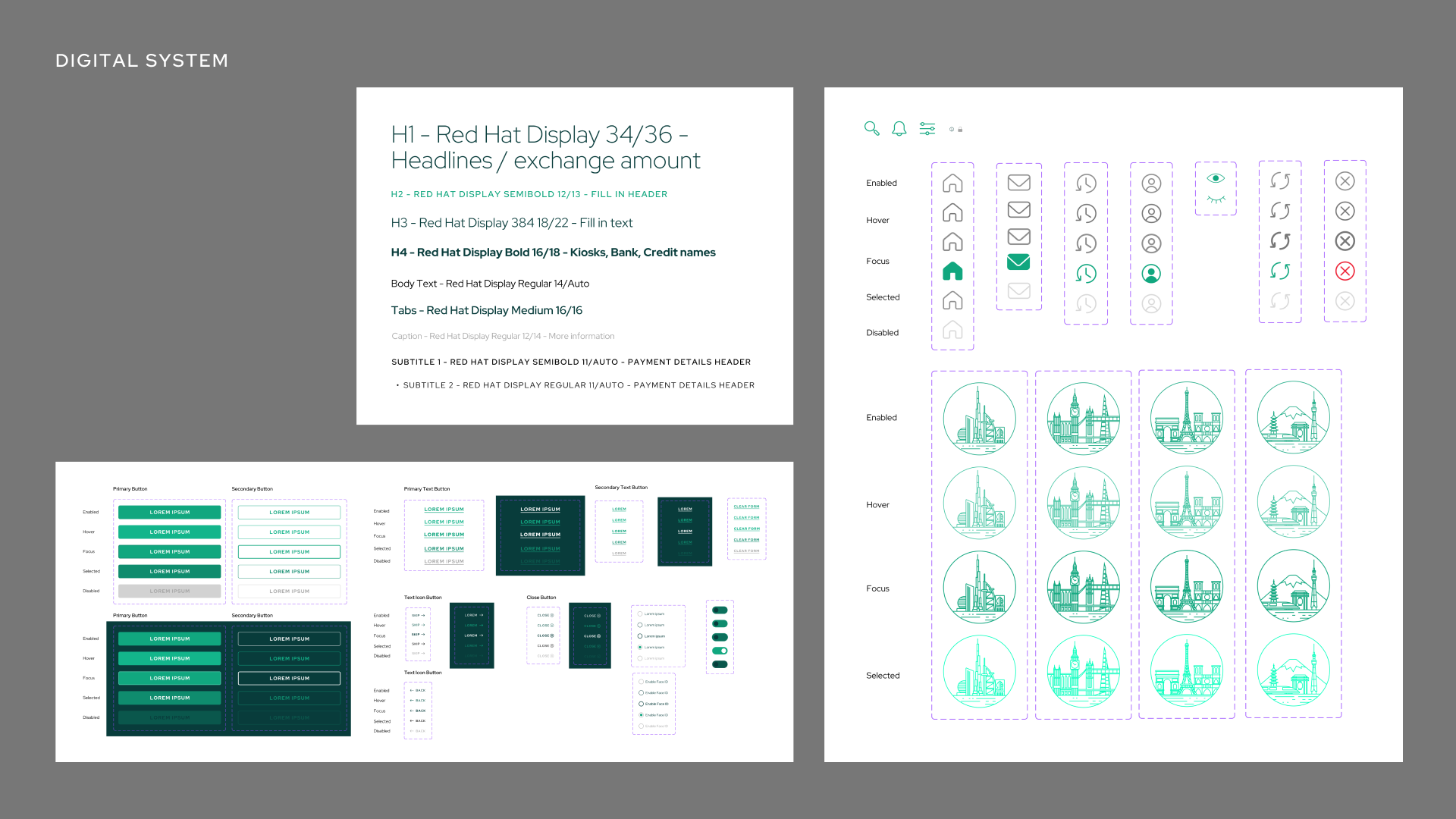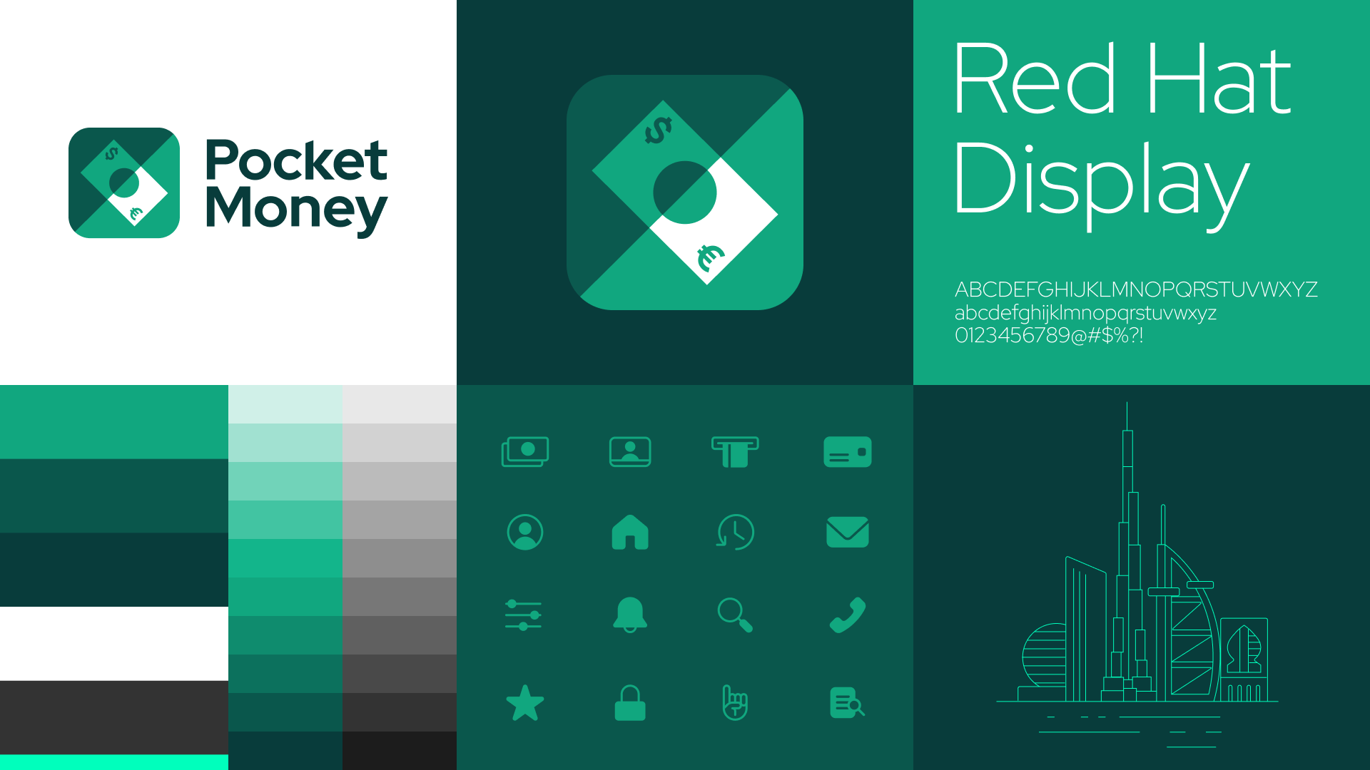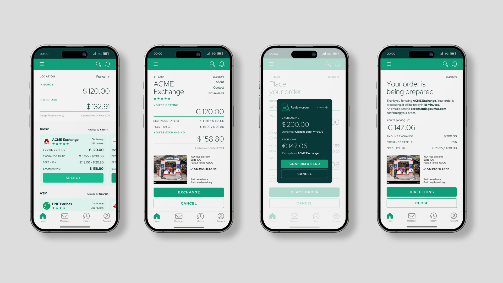 As a brand designer, it was natural for me to establish a visual language that reflects the goal statement. Each element is a strategic choice that visualizes the product principles. In this instance, green is a chosen palette as it is a familiar color for money across different regions. Dark hues establish trust and security, while the brighter palette signals positivity and modernity. The chosen type is clear and has distinct characters to avoid confusion. Meanwhile, the logo shows a transformation—passing through an exchange—using simple shapes with currency symbols on opposing corners that are customizable based on the user's origin country.